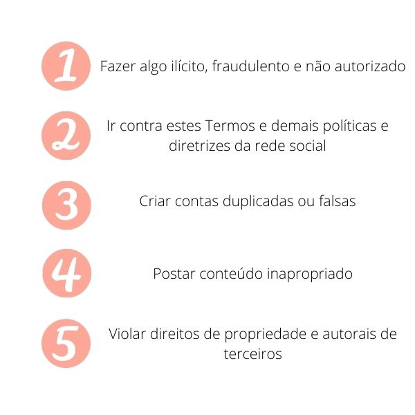 Essa rede social, assim como as demais, define em seus Termos de Uso e outras Diretrizes uma séries de regras que você não poderá fazer ao aceitar as condições da plataforma, por exemplo:
