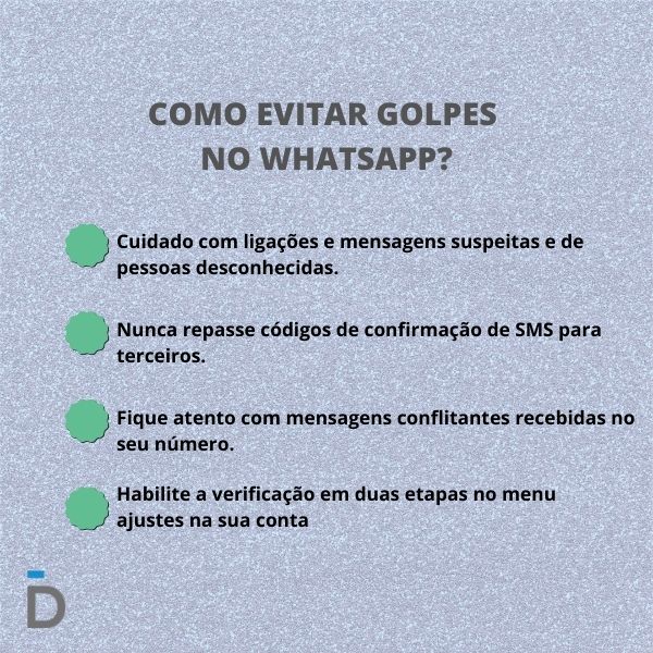 Por exemplo: desconfie de ligações em que o contato te solicita informações e códigos relacionados ao WhatsApp. Essa prática é comum para os fraudadores.