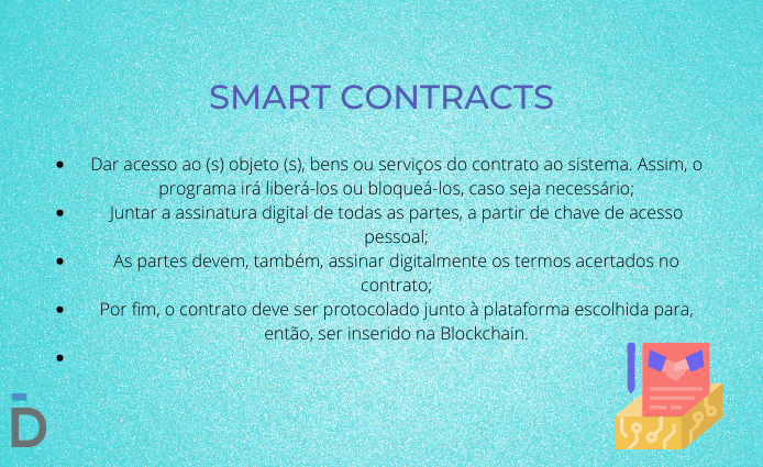A partir do Blockchain, houve a criação dos smart contracts. O smart contract é um contrato digital feito entre duas ou mais pessoas, que fica disponível no sistema como um código, e, em seguida, lido pelos computadores.